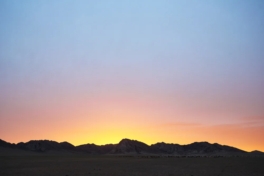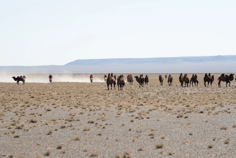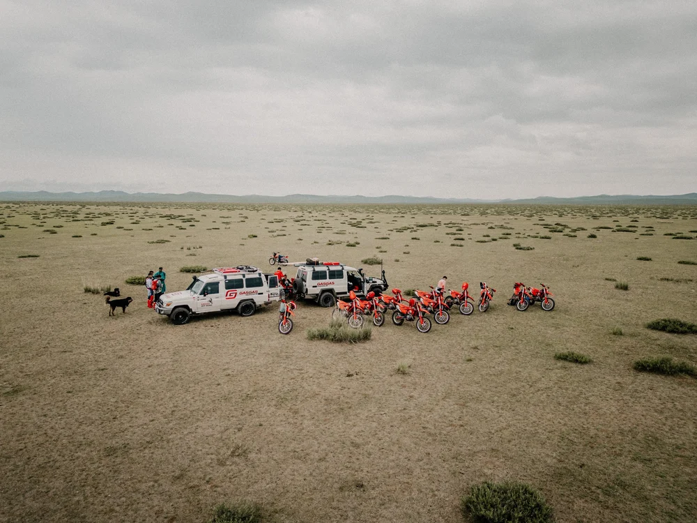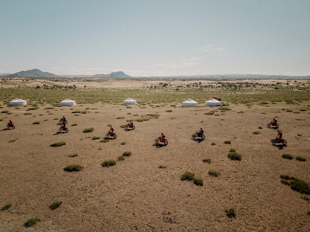 The Gobi desert is one of the most beautiful places to visit in Mongolia. You will enjoy a combination of big sand hills, rocky mountains with old canyons, as well as wide forests consisting of small saxaul trees, riding all the way back to Ulaanbaatar through endless steppes. The Gobi is the fifth biggest desert in the world and is home to a wide range of animals such as antelopes and Bactrian camels, of which you will see lots! The highest part of the Gobi is 1,580 meters and the entire area has over 1.2 million km², a true enduro paradise. The first dinosaur fossil eggs have been found at the red "Flaming Cliffs" of Bayanzag, where you will probably experience one of the most beautiful sunrises you have ever seen. Riding through the hidden 'White Stupa' rock formations which are millions of years old — all in all an unforgettable, once in a lifetime experience.
