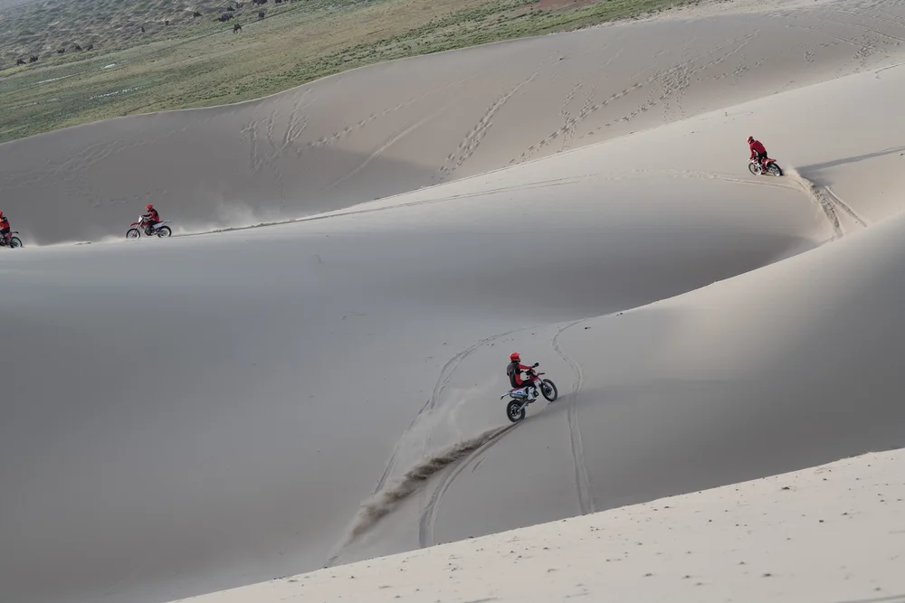 If you want to explore the most beautiful landscapes of Mongolia and experience its unique history at the same time — the LAND OF CHINGGIS tour has it all! You will ride through endless steppes, mountains, sand dunes, rivers, nomadic families and the breathtaking Erdene Zuu monastery, the earliest Buddhist monastery in Mongolia, next to Kharkhorin, the ancient Mongolian capital. Last but not least this tour also includes one day of pure sand dune riding in Elsen Tasarkhai. With 1,270km, the Orkhon is the longest river in Mongolia and is home to many species of fish. There are many rocks and boulders around the river as well as smaller waterfalls and the famous Ulaan-tsutgalan waterfall, the biggest in Mongolia at 26m high. This tour is 90% off-road.